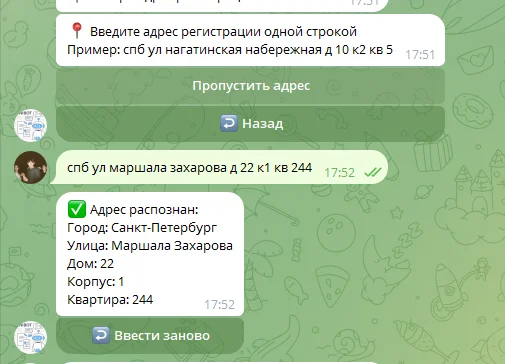 Каждое поле проверяется сразу при вводе. Адрес распознаётся и разбивается на компоненты: город, улица, дом, квартира.