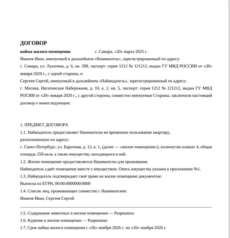 Итоговый договор, автоматически сформированный ботом на основе диалога