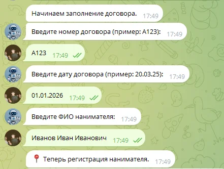 После завершения данные автоматически подставляются в договор, формируется файл и отправляется пользователю.
