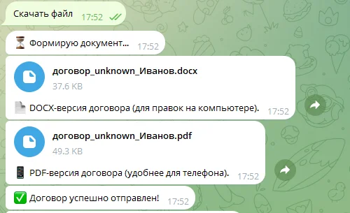После завершения диалога бот формирует договор и отправляет его в двух форматах: DOCX для редактирования на компьютере и PDF для просмотра на телефоне.